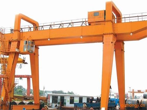 門式起重機是橋式起重機的一種變形,又叫龍門吊。主要用于室外的貨場、料場貨、散貨的裝卸作業。它的金屬結構像門形框架,承載主梁下安裝兩條支腳,可以直接在地面的軌道上行走,主梁兩端可以具有外伸懸臂梁。門式起重機具有場地利用率高、作業范圍大、適應面廣、通用性強等特點,在港口貨場得到廣泛使用。